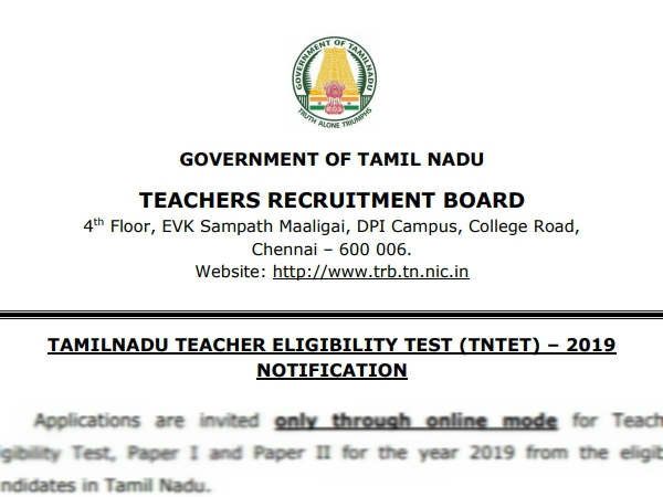 TN TET Notification 2019 : Tamilnadu TET Recruitment - Apply Online
