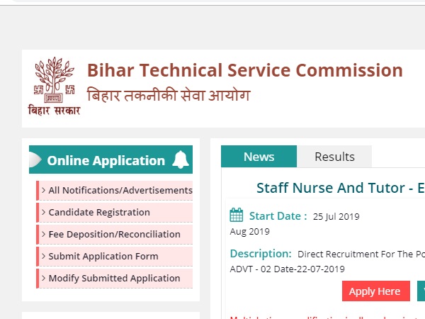 மத்திய அரசின் கீழ் செயல்பட்டு வரும் பீகார் தொழில்நுட்ப சேவை ஆணையத்தில் செவிலியர் மற்றும் டியூட்டர் பணியிடங்களை நிரப்புவதற்கான அறிவிப்பு வெளியிடப்பட்டுள்ளது. நர்ஸ் பணிக்கு 9130 பேரும் ட்யூட்டர் பணிக்கு 169 பேரும் தேர்வு செய்யப்பட உள்ளனர். மொத்தம் 9299 காலிப் பணியிடங்களை நிரப்பப்பட உள்ளன.