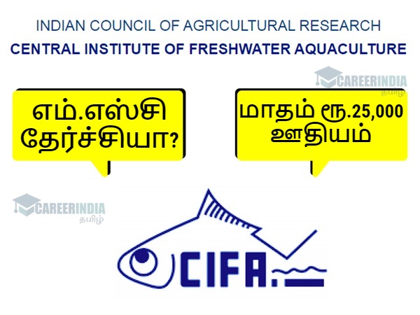 மத்திய அரசின் கீழ் செயல்பட்டு வரும் மத்திய நன்னீர் மீன் வளர்ப்பு நிறுவனத்தில் (CIFA) காலியாக உள்ள Young Professional பணியிடத்தினை நிரப்பிடுவதற்கான அறிவிப்பு வெளியிடப்பட்டுள்ளது. எம்.எஸ்சி பிரிவில் விலங்கியல் துறையில் தேர்ச்சி பெற்றவர்கள் இப்பணியிடத்திற்கு விண்ணப்பிக்கலாம். தகுதியும், விருப்பமும் உள்ளவர்கள் கீழ்காணும் முறையில் வரும் ஜூலை 10ம் தேதிக்குள் விண்ணப்பித்துப் பயனடையலாம்.