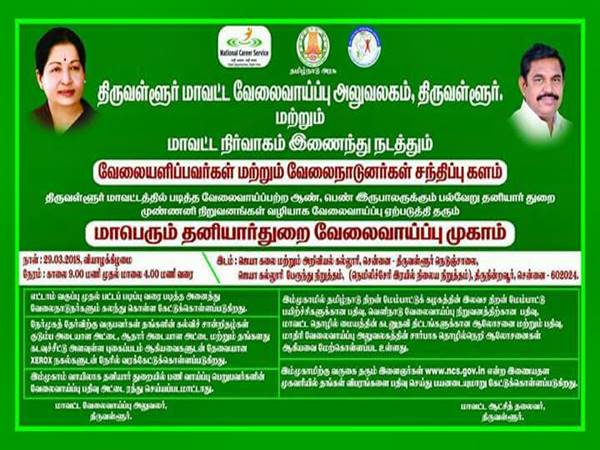 திருவள்ளூர் மாவட்ட வேலைவாய்ப்பு அலுவலகம் சார்பில் தனியார் சிறப்பு வேலை வாய்ப்பு முகாம் நாளை (29 ஆம் தேதி) ஜெயா கலை மற்றும் அறிவியல் கல்லூரியில் நடைபெறுகிறது.