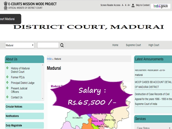 விண்ணப்பிக்கும் முறை : http://ecourts.gov.in/tn/madurai என்னும் லிங்கில் உள்ள விண்ணப்பத்தினை பதிவிறக்கம் செய்து, பூர்த்தி செய்த விண்ணப்பத்தினை அறிவிப்பில் உள்ள முகவரிக்கு அனுப்பி வைக்க வேண்டும்.