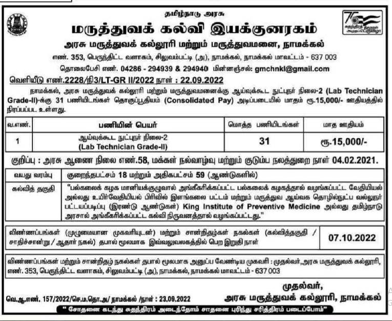 நாமக்கல் அரசு மருத்துவக்கல்லூரி மற்றும் மருத்துவமனையில், 31 லேப் டெக்னீசியன் பணியிடங்களுக்கு ஆர்வமும், தகுதியும் உள்ளவர்கள் விண்ணப்பிக்கலாம் என, அறிவிப்பு வெளியிடப்பட்டுள்ளது.