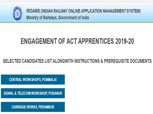 தெற்கு ரயில்வே துறைக்கு உட்பட்ட பொன்மலை, பெரம்பூர், பொடனூர் ஆகிய பணிமனைகளில் கார்பெண்டர், எலெக்ட்ரீசியன், மெக்கானிக் உள்ளிட்ட பல்வேறு ஐடிஐ டிரேடு அப்ரண்டிஸ் பயிற்சி பணியிடங்கள் நிரப்புவதற்கான அறிவிப்பு கடந்த டிசம்பர் மாதம் வெளியாகி விண்ணப்பங்கள் பெறப்பட்டன.