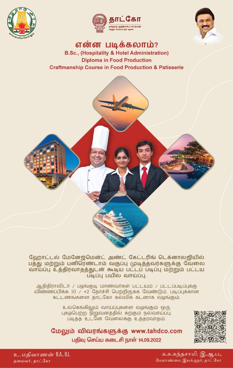 உலகளவில் புகழ்பெற்று விளங்கும் 'இன்ஸ்டிடியூட் ஆஃப் ஹோட்டல் மேனேஜ்மென்ட் கேட்டரிங் டெக்னாலஜி & அப்ளைடு நியூட்ரிஷன்' நிறுவனத்தில், பி.எஸ்சி., பட்டப்படிப்பு மற்றும் பட்டயப் படிப்புக்கு விண்ணப்பிக்கலாம் என, தமிழ்நாடு ஆதிதிராவிடர் வீட்டு வசதி மற்றும் மேம்பாட்டுக்கழகம் அறிவித்துள்ளது.