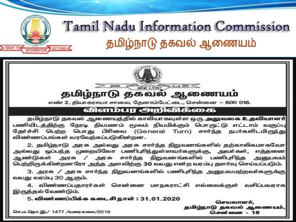 மேற்கண்ட தமிழ்நாடு தகவல் ஆணையத்தில் அலுவலக உதவியாளர் பணியில் சேருவதற்குத் தகுதியும் விருப்பமும் உள்ளவர்கள், தங்களுடைய விண்ணப்பப்படிவத்தை வரும் ஜனவரி 31 ஆம் தேதிக்குள் தமிழ்நாடு தகவல் ஆணையத்துக்கு அனுப்ப வேண்டும்.
