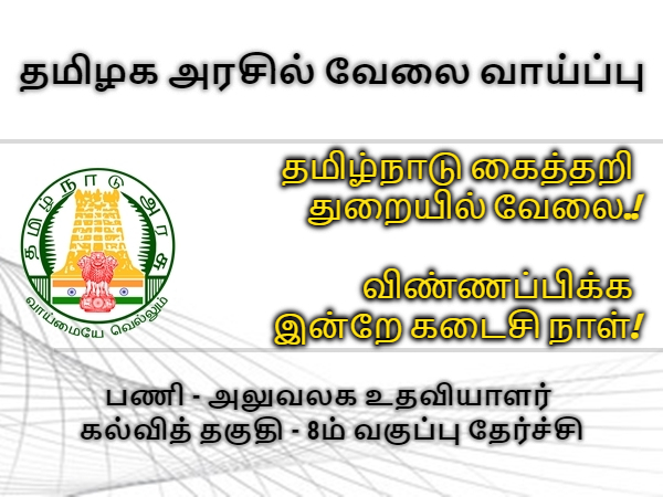 தமிழ்நாடு கைத்தறி மற்றும் ஜவுளித் துறையில் காலியாக உள்ள அலுவலக உதவியாளர் பணியிடத்தினை நிரப்பிடுவதற்கான அறிவிப்பு வெளியிடப்பட்டு விண்ணப்பங்கள் பெறப்பட்டு வருகின்றன. இப்பணியிடங்களுக்கு விண்ணப்பிக்க இன்றே கடைசி நாளாகும். விண்ணப்பிக்க தவறியவர்கள் உடனடியாக விண்ணப்பித்துப் பயனடையலாம்.