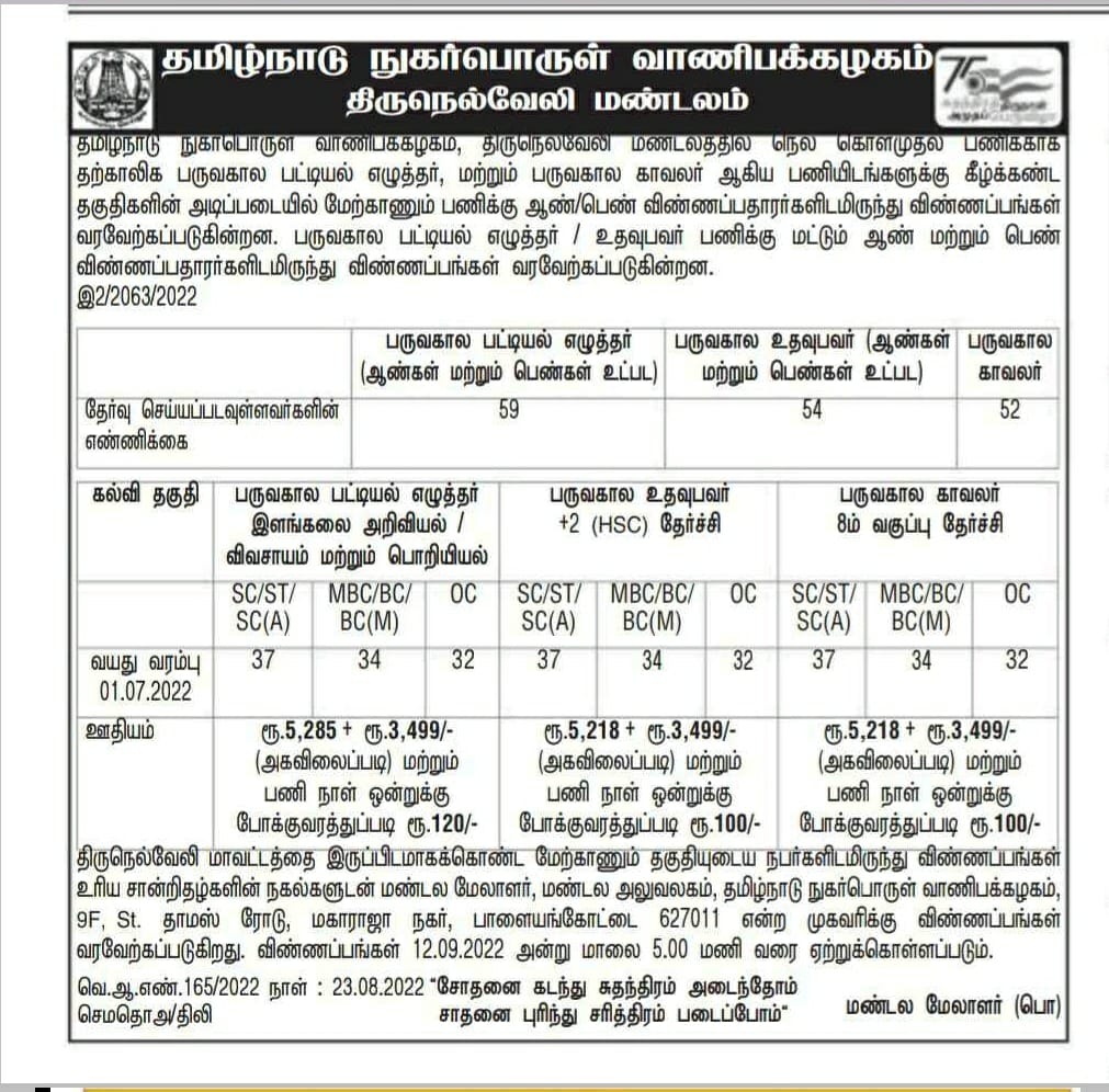 தமிழ்நாடு நுகர்பொருள் வாணிபக் கழகம், திருநெல்வேலி மண்டலத்தில் நெல் கொள்முதல் பணிக்காக தற்காலிக பட்டியல் எழுத்தர், பருவகால காவலர் ஆகிய பணியிடங்களுக்கு, தகுதி, ஆர்வமுள்ள ஆண்/பெண் விண்ணப்பதாரர்கள் விண்ணப்பிக்கலாம் என, அறிவிப்பு வெளியாகியுள்ளது.