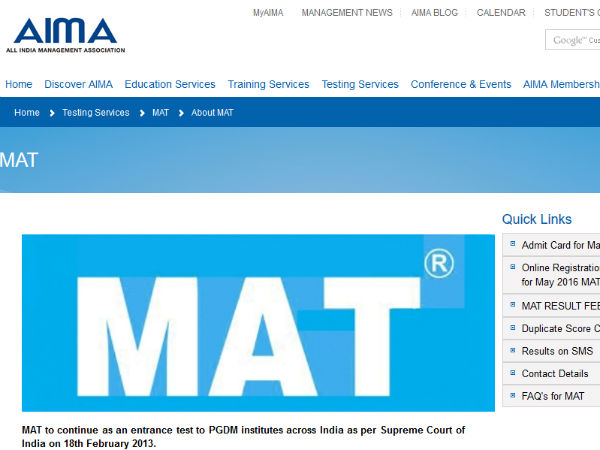 ஹால் டிக்கெட்டுகளை டவுன்லோடு செய்வது எப்படி? இந்தத் தேர்வுக்கான ஹால் டிக்கெட்டுகளைப் பெற https://www.aima.in/testing-services/mat/mat.html என்ற இணையதளத்தைத் தொடர்புகொள்ளவேண்டும். பின்னர் 'AIMA MAT May 2016 Admit Card' என்ற இடத்தில் கிளிக் செய்து தேவையான விவரங்களைக் கொடுத்து ஹால் டிக்கெட்டுகளைப் பெற்றுக் கொள்ளலாம்.