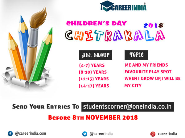 குழந்தைகள் தினத்தை முன்னிட்டு நம் கேரியர் இந்தியா, குழந்தைகளை உற்சாகமூட்டும் வகையில் ஓவியப் போட்டியினை நடத்தவுள்ளது. "சித்ரகலா 2018" என்னும் இந்த நிகழ்ச்சியில் உங்களது குழந்தையையும் பங்கேற்கச் செய்து அவர்களது ஓவியத் திறமைகளை வெளிப்படுத்துங்கள். முழுவதும், ஆன்லைன் முறையில் நடைபெறும் இப்போட்டி குறித்த மேலும் தகவல்கள் இங்கே.