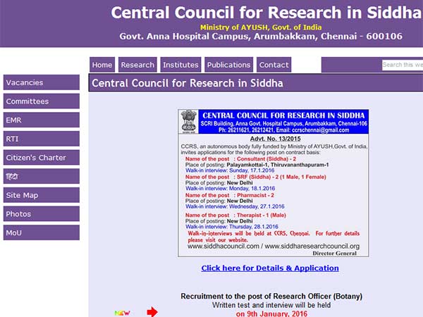 Central Council for Research in Siddha (CCRS), invited applications for Consultant, Senior Research Fellow, Pharmacist, and Therapist posts. The eligible candidates can appear for walk in interview on 17, 18, 27 & 28 January 016. Eligible candidates can walk in for an interview on the data and time mentioned for the respective post in the detailed notification. Important Date: Date and time of Walk in interview: 17, 18, 27 & 28 January 2016. About CCRS: National Institute of Siddha is a premier institute of Siddha medicine situated at Tambaram, Chennai, India, established to provide research and higher studies facility and help in securing global recognition for the Siddha system of medicine. It is one of the seven apex national-level educational institutions that promote excellence in Indian system of medicine and Ayurveda. It is the national headquarters of the Central Council of Research in Siddha (CCRS), the exclusive body for Siddha research.