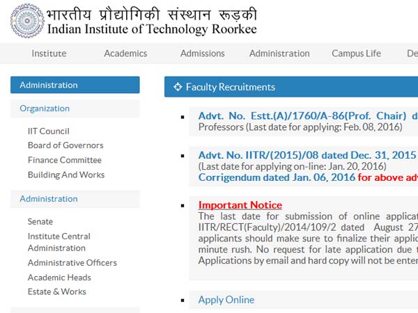Indian Institute of Technology (IIT), Roorkee invited applications for the post of Associate Professor. The eligible candidates can apply to the post through the prescribed format on or before 20 January 2016. Eligible candidates can apply to the post through http://www.iitr.ac.in/administration/pages/Openings+Faculty.html so as to reach on or before 20 January 2016. Important Dates: Publication of the Advertisement: 31 December 2015. Last Date to Apply: 20 January 2016. About IIT Roorkee: Indian Institute of Technology Roorkee (commonly known as IIT Roorkee or IITR), formerly the University of Roorkee (1948-2001) and the Thomason College of Civil Engineering (1853-1948), is a public university located in Roorkee, Uttarakhand, India. Established in 1847 in British India by the then lieutenant governor, Sir James Thomason, it was given university status in 1949 and was converted into an Indian Institute of Technology (IIT) in 2001, thus becoming the seventh IIT to be declared.