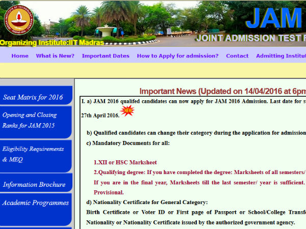எஸ்சி, எஸ்டி, ஓபிசி பிரிவினர் தங்களது ஜாதி சான்றிதழையும் சமர்ப்பிக்கவேண்டும். கூடுதல் விவரங்களுக்கு http://jam.iitm.ac.in/jam2016/ என்ற இணையதளத்தை அணுகலாம்.