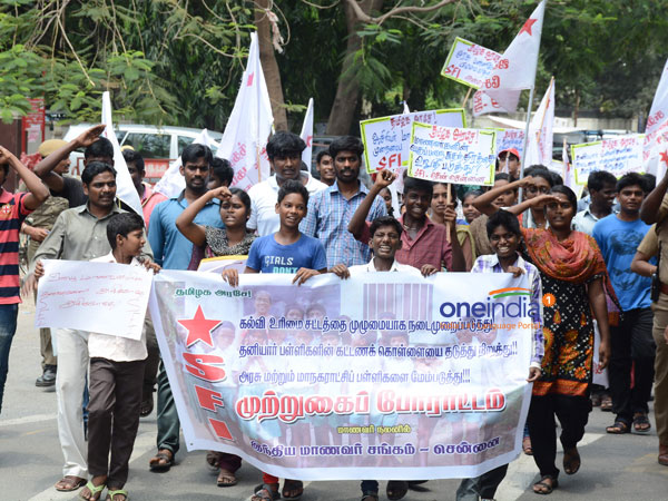 சென்னை: தமிழகத்தில் தனியார் பள்ளிக்கூடங்களில் கல்வி உரிமை சட்டத்தை முழுமையாக அமல்படுத்தக்கோரி இந்திய மாணவர்கள் சங்கம் சார்பில் சென்னை டி.பி.ஐ வளாகம் முன்பாக மறியல் போராட்டம் நடந்தது.