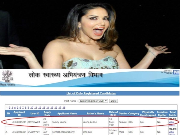பீகார், சுகாதாரத்துறையில் இளநிலை பொறியாளர் பதவிக்காக விண்ணப்பித்தவர்களை, தகுதி அடிப்படையில் வரிசைப்படுத்தி அம்மாநில அரசுத்துறை வெளியிட்டுள்ள பட்டியலில் நடிகை சன்னி லியோன் பெயர் முதலிடத்தில் இடம்பெற்றுள்ளது பெரும் சர்ச்சையை ஏற்படுத்தியுள்ளது.