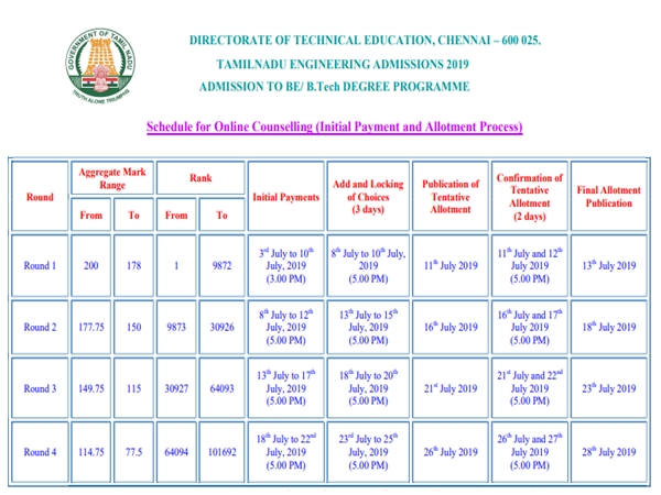 அட்டவணையை http://tnea2019doc.xyz/pdf/schdule.pdf?V=1 என்னும் இணையதள முகவரியில் பெற்றுக்கொள்ளலாம்.